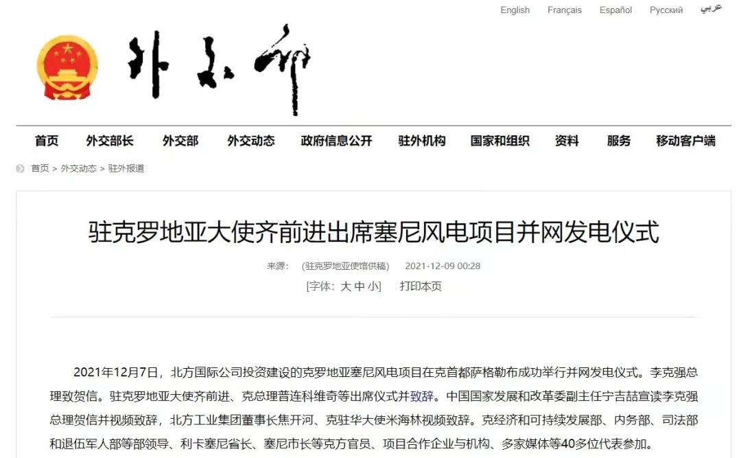 2021年12月7日,中國兵器工業(yè)集團有限公司北方公司所屬北方國際投資、建設和運營(yíng)的塞尼156MW風(fēng)電項目在克羅地亞首都薩格勒布隆重舉行并網(wǎng)發(fā)電儀式。李克強總理致賀信??肆_地亞總理安德烈·普連科維奇,中國駐克羅地亞大使齊前進(jìn)出席儀式并致辭。中國國家發(fā)展和改革委員會(huì )副主任寧吉喆宣讀李克強總理賀信并視頻致辭,中國兵器工業(yè)集團有限公司董事長(cháng)焦開(kāi)河、克駐華大使米海林視頻致辭。 中華人民共和國外交部報道 普連科維奇總理在致辭中表示,感謝李克強總理發(fā)來(lái)賀信,他與中國領(lǐng)導人一直非常重視塞尼風(fēng)電項目投資與建設。祝賀項目克服疫情與地震等影響,成功并網(wǎng)發(fā)電。增加清潔可再生能源、綠色電力對克乃至歐洲都很重要,克政府的重要戰略和目標之一就是低碳發(fā)展和增加清潔能源供應。塞尼風(fēng)電項目占克總發(fā)電量將達3.5%,對克實(shí)現2022年可再生能源比例30%目標具有很大幫助。此次投資使北方國際成為在克最大的清潔能源投資企業(yè)。非常歡迎更多中國企業(yè)擴大對克投資。 寧吉喆宣讀李克強總理賀信并視頻致辭時(shí)表示,2017年11月第六次中國—中東歐國家領(lǐng)導人會(huì )晤期間,在李克強總理和普連科維奇總理等中東歐16國領(lǐng)導人的共同見(jiàn)證下,塞尼項目簽署了協(xié)議。項目既是中國堅定踐行綠色發(fā)展理念的具體體現,也是中國深化與克羅地亞、與中東歐國家務(wù)實(shí)合作的生動(dòng)實(shí)踐。希望中克兩國政府部門(mén),企業(yè)等有關(guān)各方共同努力、相互配合,運營(yíng)好塞尼項目,打造出中歐綠色合作的樣板,帶動(dòng)兩國務(wù)實(shí)合作持續深入發(fā)展,造福兩國人民。