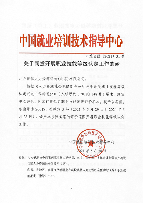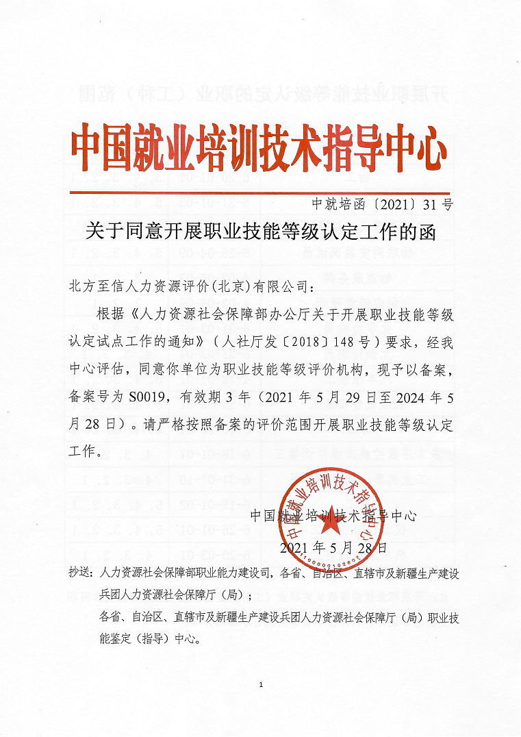 5月28日,人力資源社會保障部中國就業(yè)培訓(xùn)技術(shù)指導(dǎo)中心發(fā)布了《關(guān)于同意開展職業(yè)技能等級認(rèn)定工作的函》(中就培函〔2021〕31號),北方至信人力資源評價(北京)有限公司(以下簡稱“北方至信”)成為首家央企全國性社會培訓(xùn)評價組織職業(yè)技能等級認(rèn)定機構(gòu)。